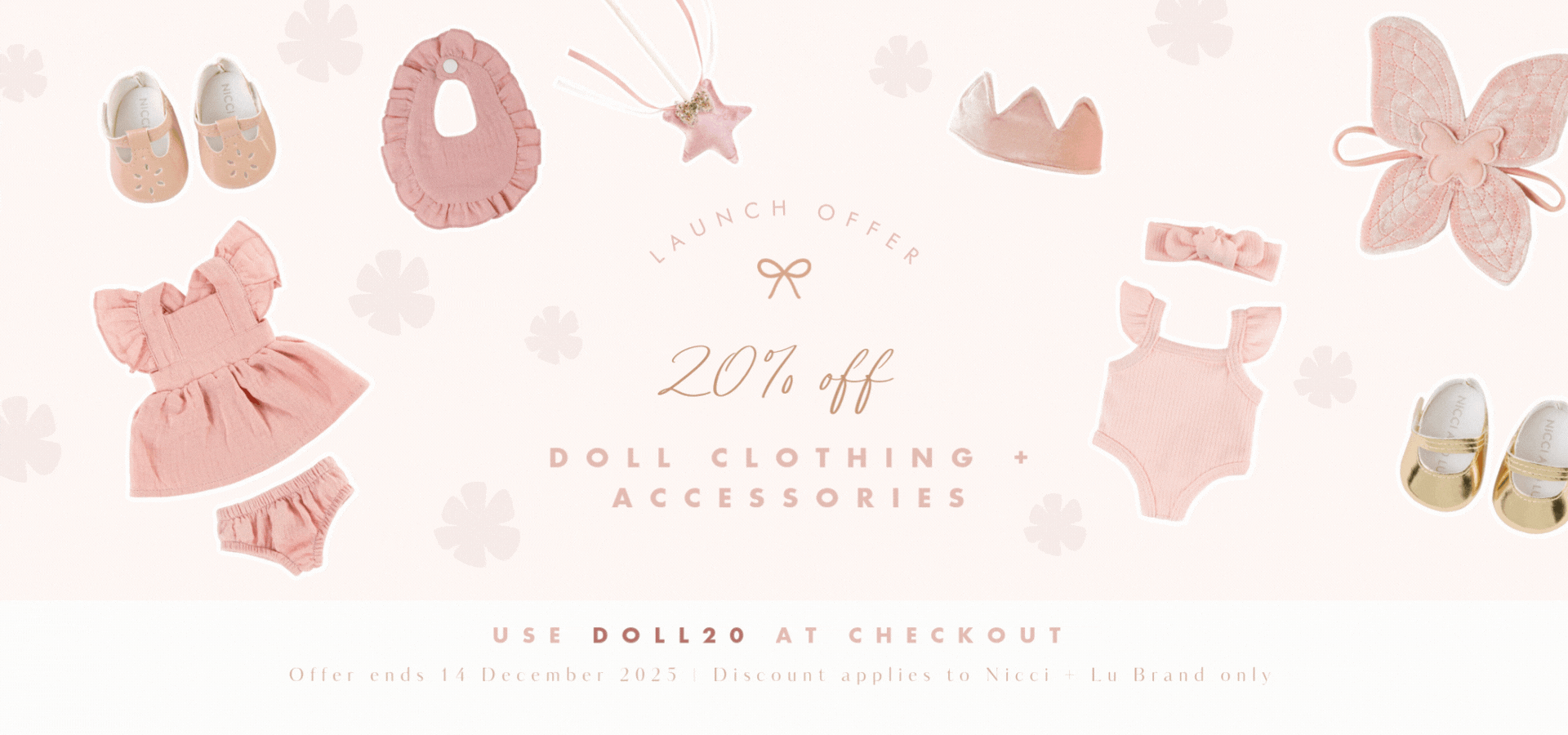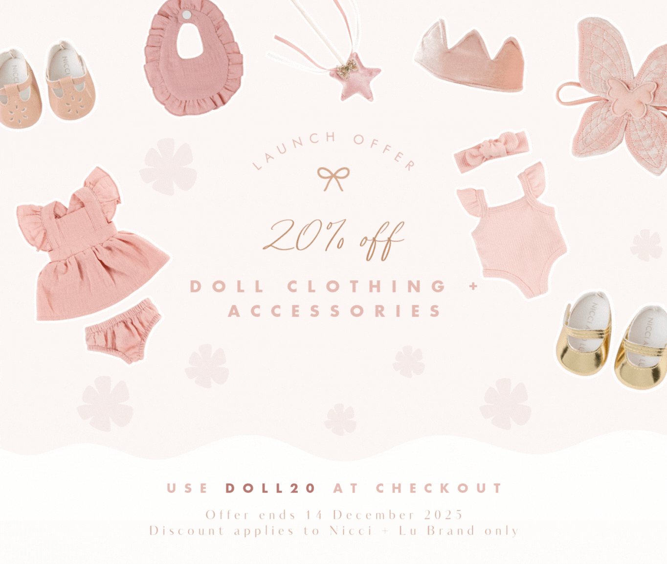 Nicci and Lu has the most beautiful collection of doll clothing, carefully designed to spark joy and endless play. From soft pinks and timeless neutrals to layers of magical tulle, our pieces are made to inspire your little one’s imagination and bring their dolls’ wardrobe to life.