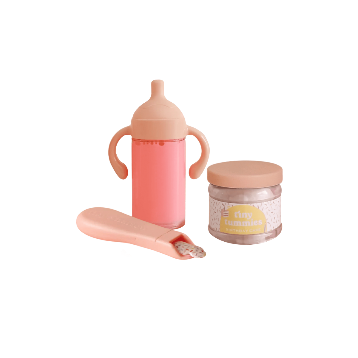 The Tiny Birthday Set is the perfect addition to your store, featuring Tiny Harlow’s first-ever sippy cup and a Magic Birthday Cake Flavour Tiny Tummies Dolls Food Jar – a must-have for little nurturers! The strawberry milk sippy cup magically disappears as dolly drinks, adding realistic play value.